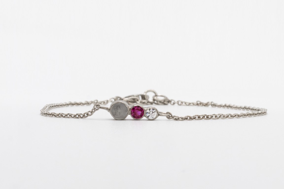 Deze fijne armband combineert een ronde steen met een inclusie naar keuze met twee geboortestenen.