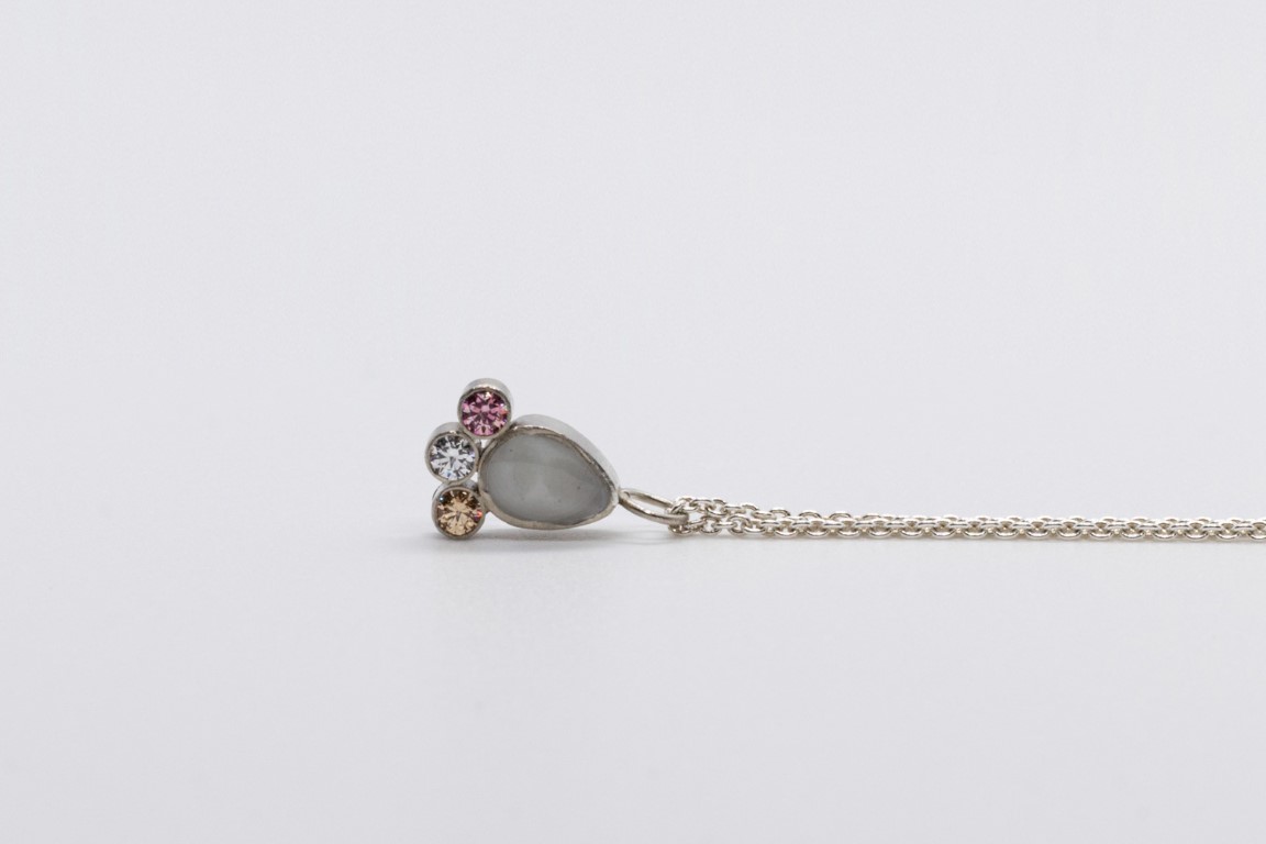 Deze fijne hanger bestaat uit een druppel met een inclusie naar keuze en 3 kleine geboortesteentjes die jouw verhaal verder aanvullen.