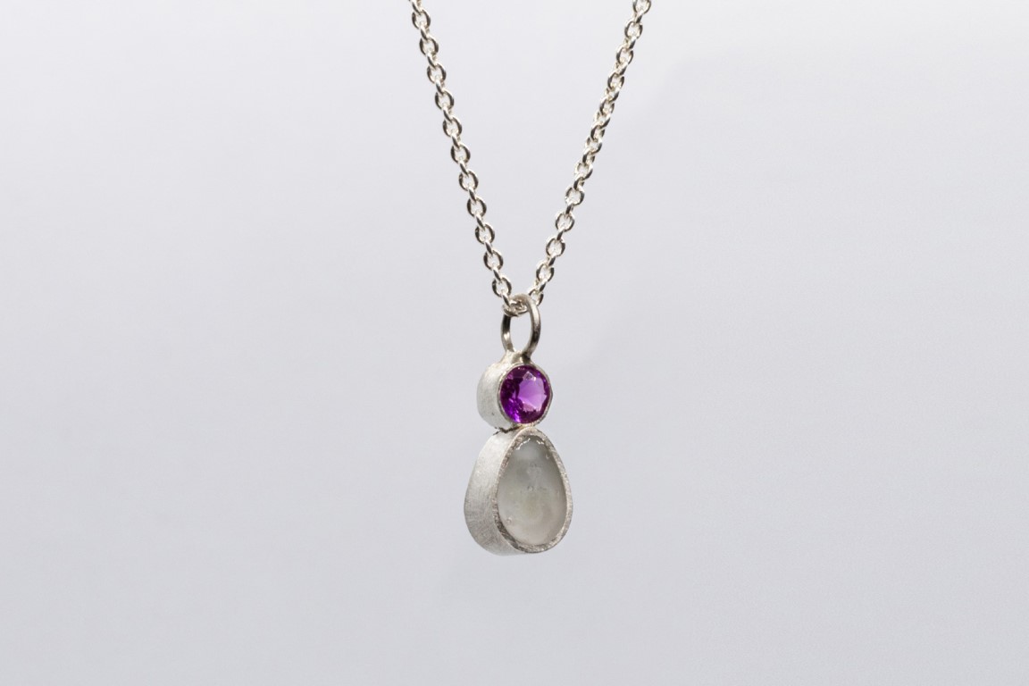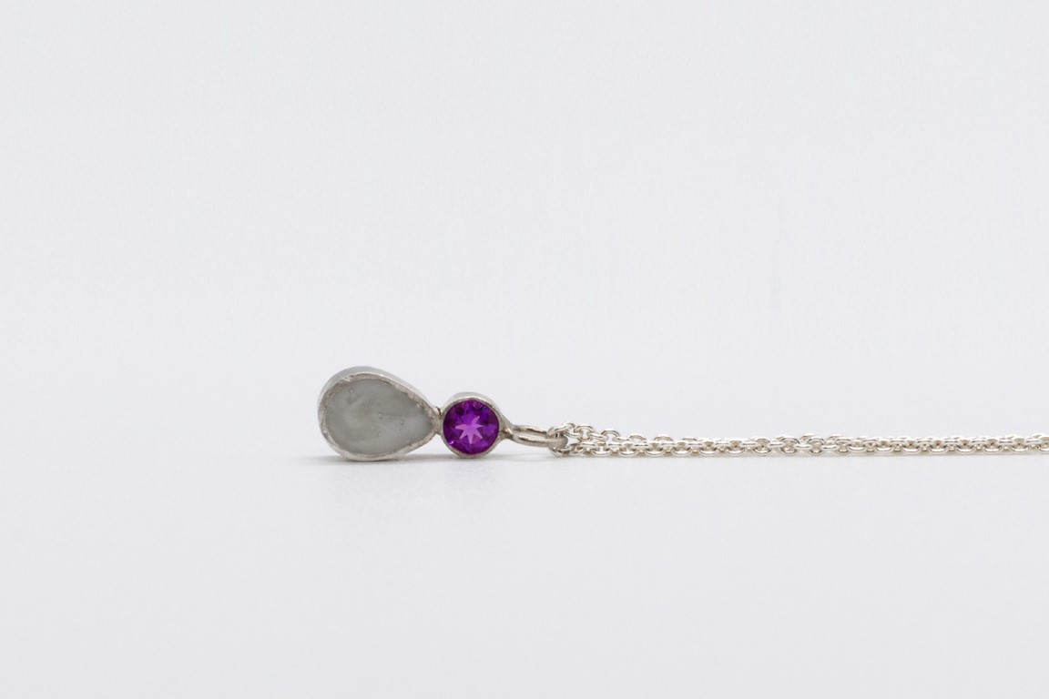 Deze fijne hanger bestaat uit een druppel met een inclusie naar keuze en een mooie geboortesteen die jouw verhaal verder aanvult.