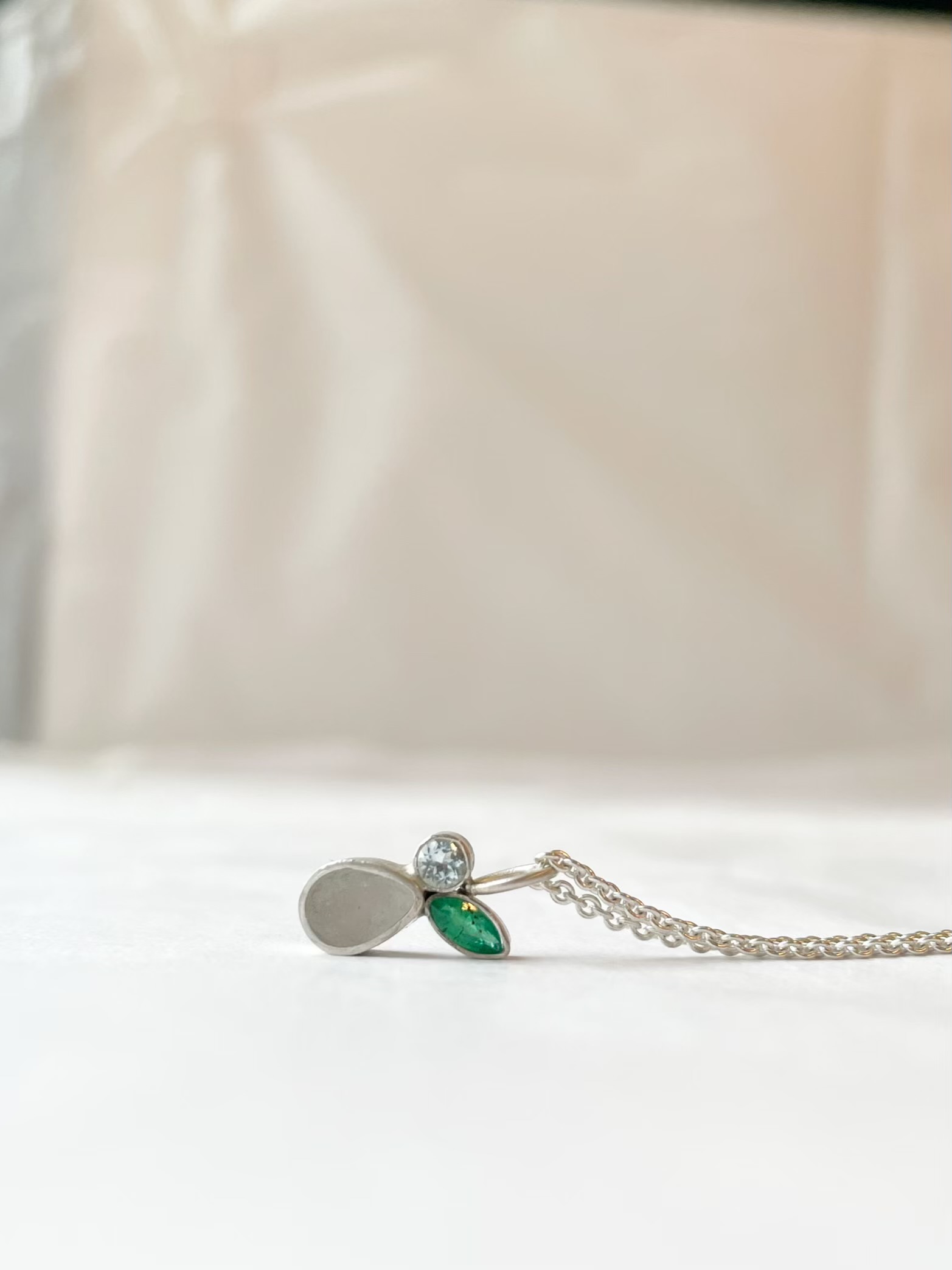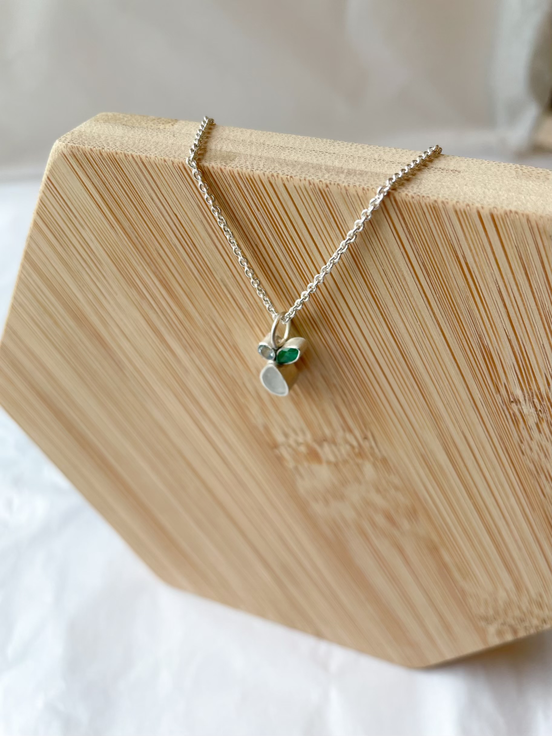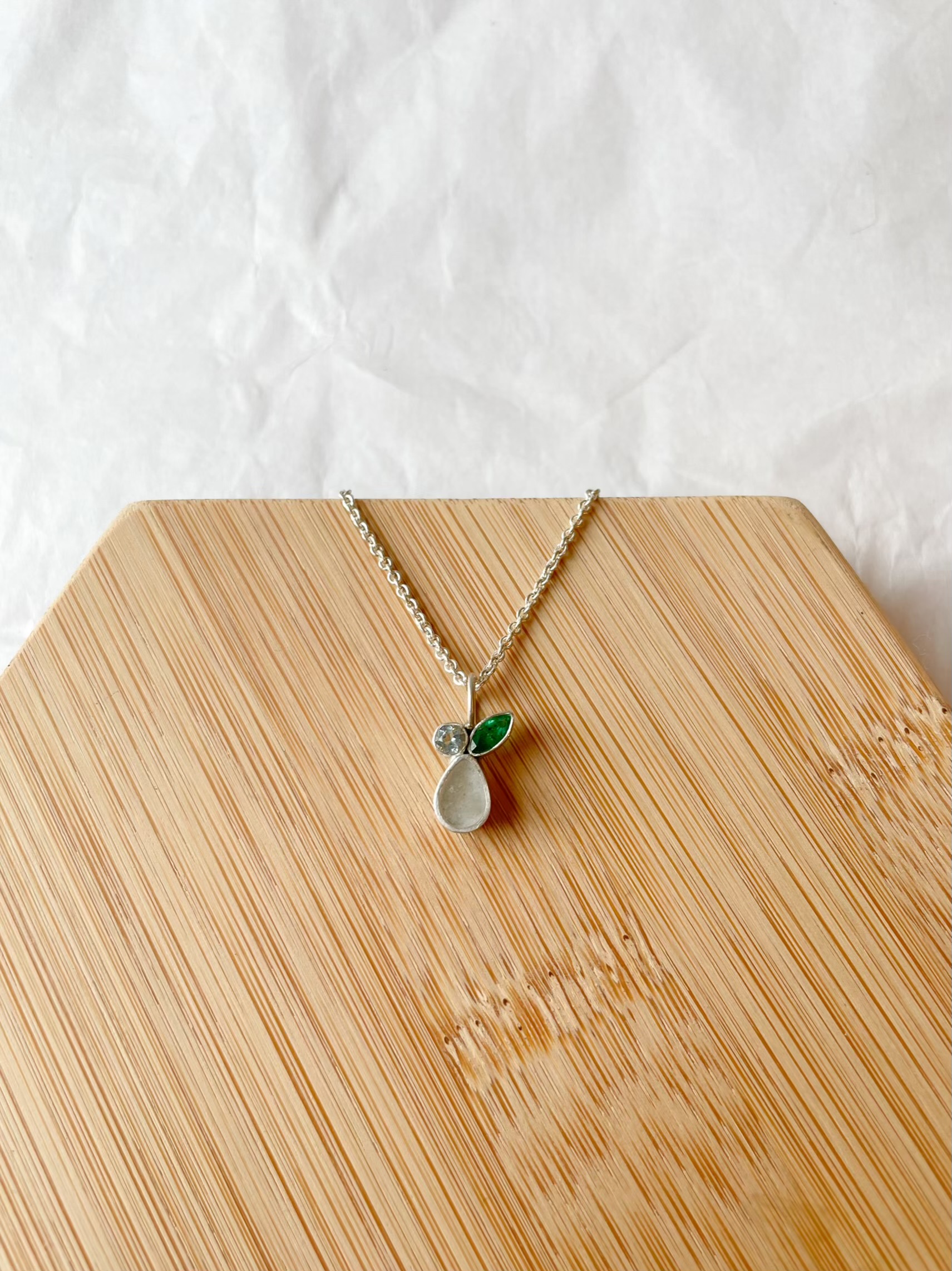 Deze fijne hanger bestaat uit een druppel met een inclusie naar keuze en twee geboortesteentjes die jouw verhaal verder aanvullen.