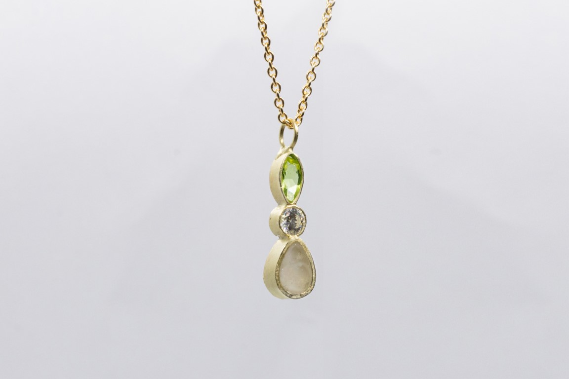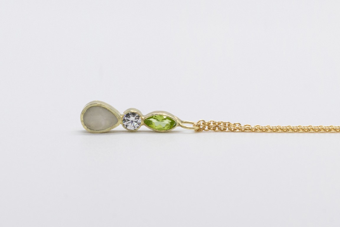 Deze fijne hanger bestaat uit een druppel met een inclusie naar keuze en twee geboortesteentjes die jouw verhaal verder aanvullen.