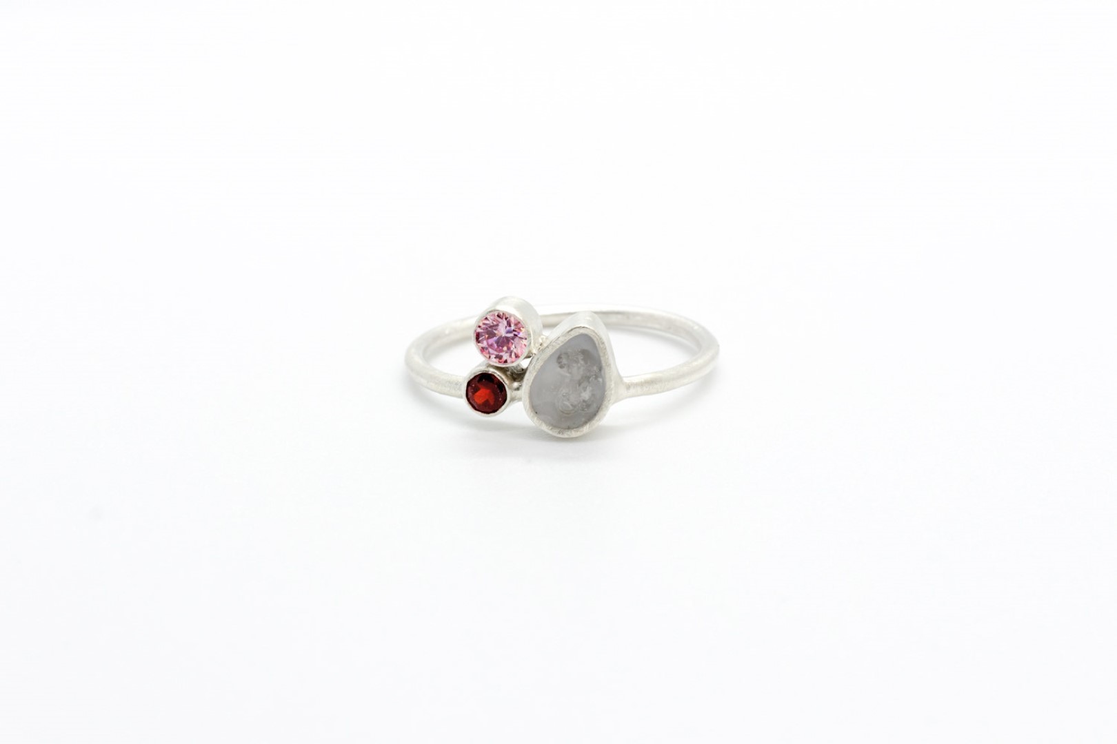 Een druppelvormige steentje wordt gevuld met een inclusie naar keuze, aangevuld met twee geboortesteentjes die jouw verhaal mee vormgeven.