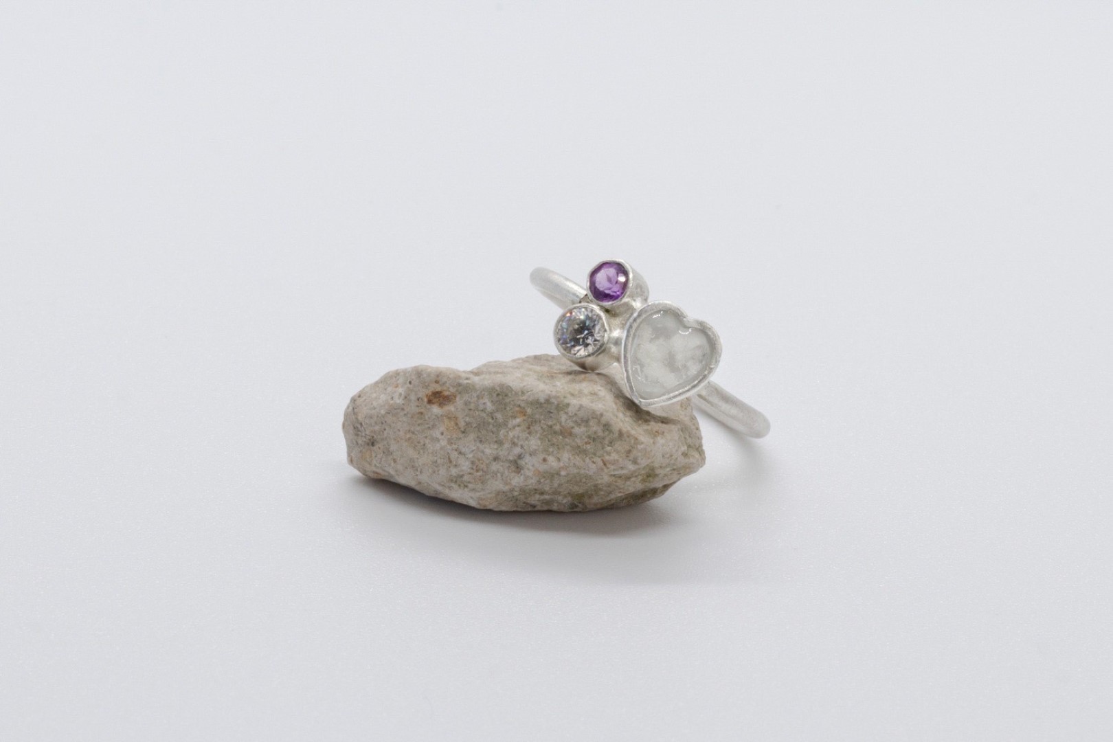 Een hartvormig steentje wordt gevuld met een inclusie naar keuze, aangevuld met twee geboortesteentjes die jouw verhaal mee vormgeven.