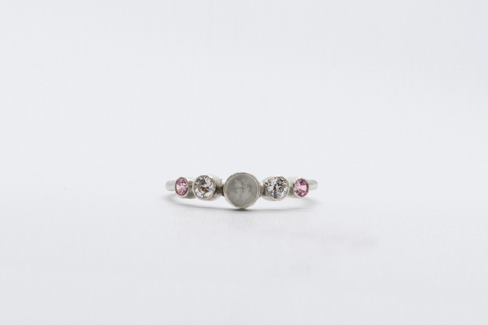 Een rond steentje in het midden wordt gevuld met een inclusie naar keuze, aangevuld met vier geboortesteentjes die jouw verhaal mee vormgeven.