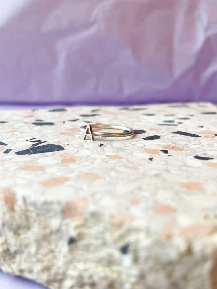 Deze fijne stacking ring kan afgewerkt worden met een drukletter naar keuze, klein, ingetogen en betekenisvol.