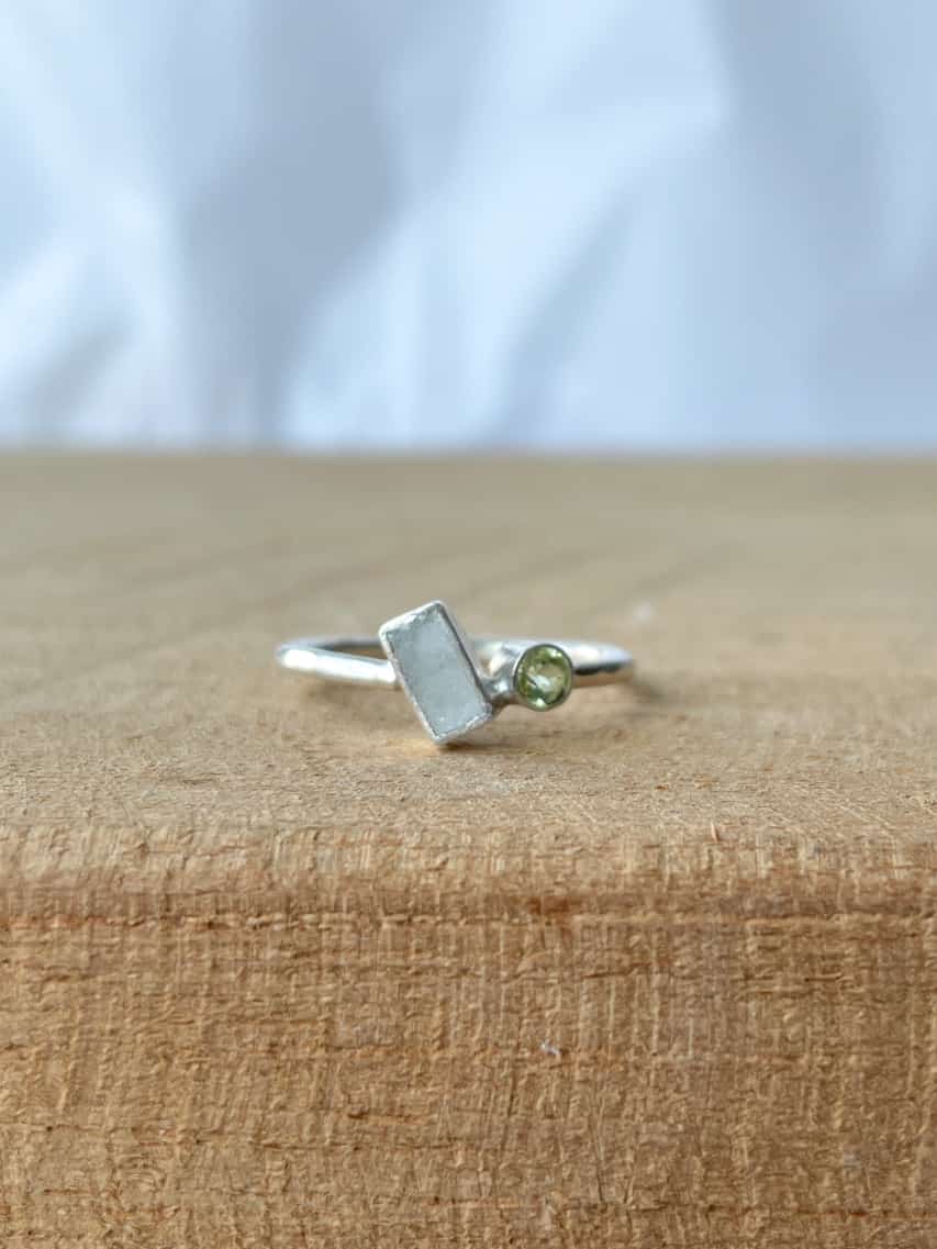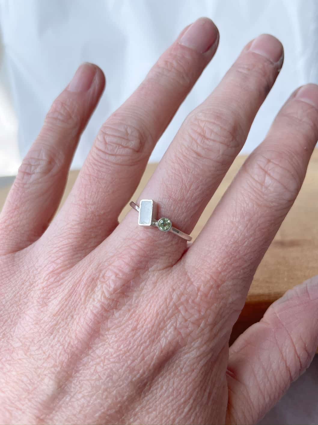 Is deze unieke fijne ring met een rechthoekig steentje om een inclusie naar keuze in te verwerken, en een geboortesteentje.