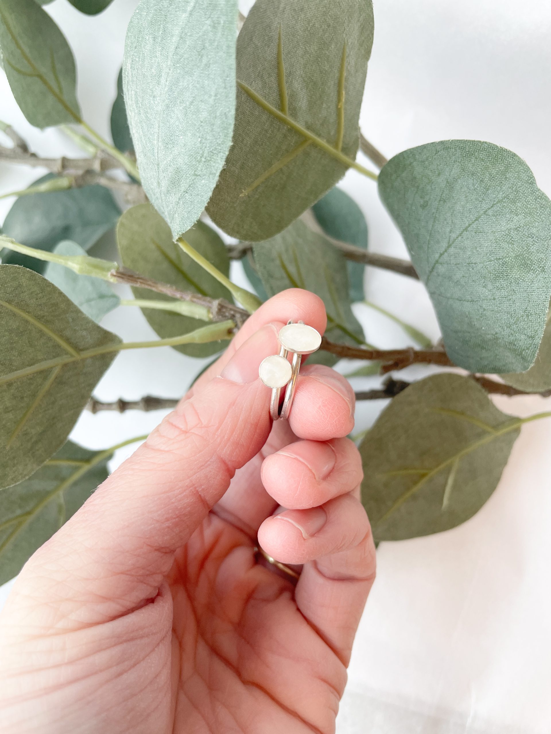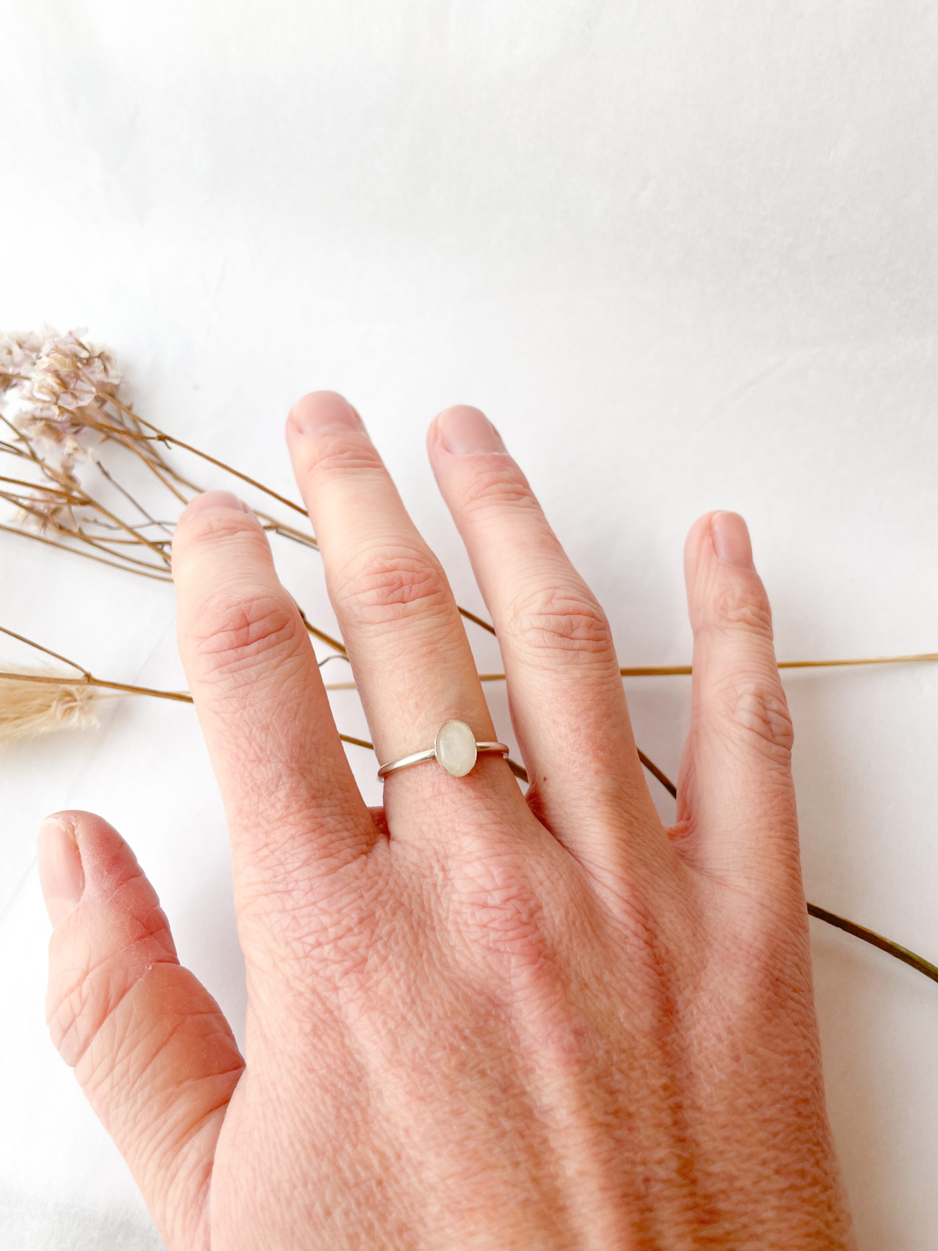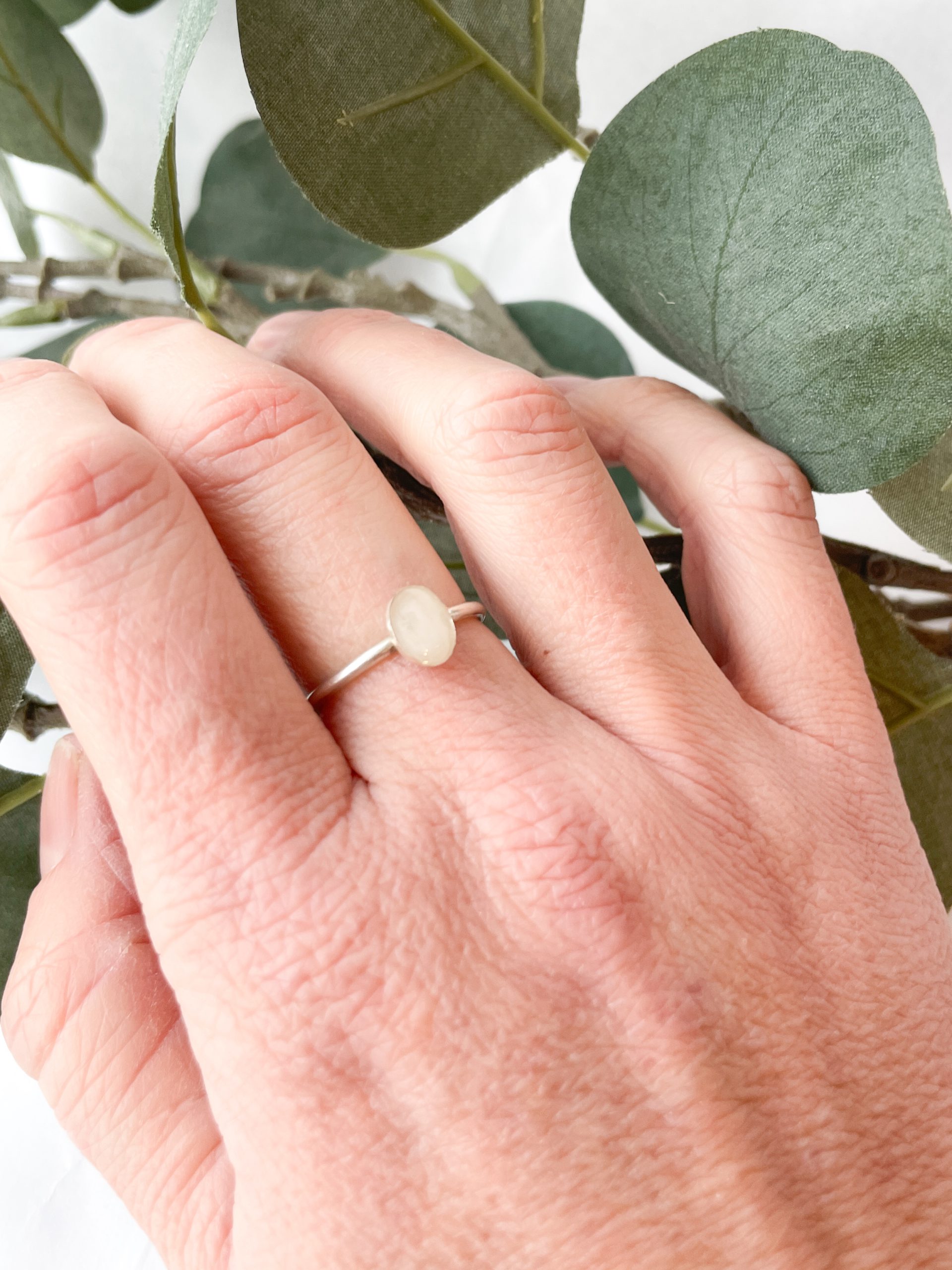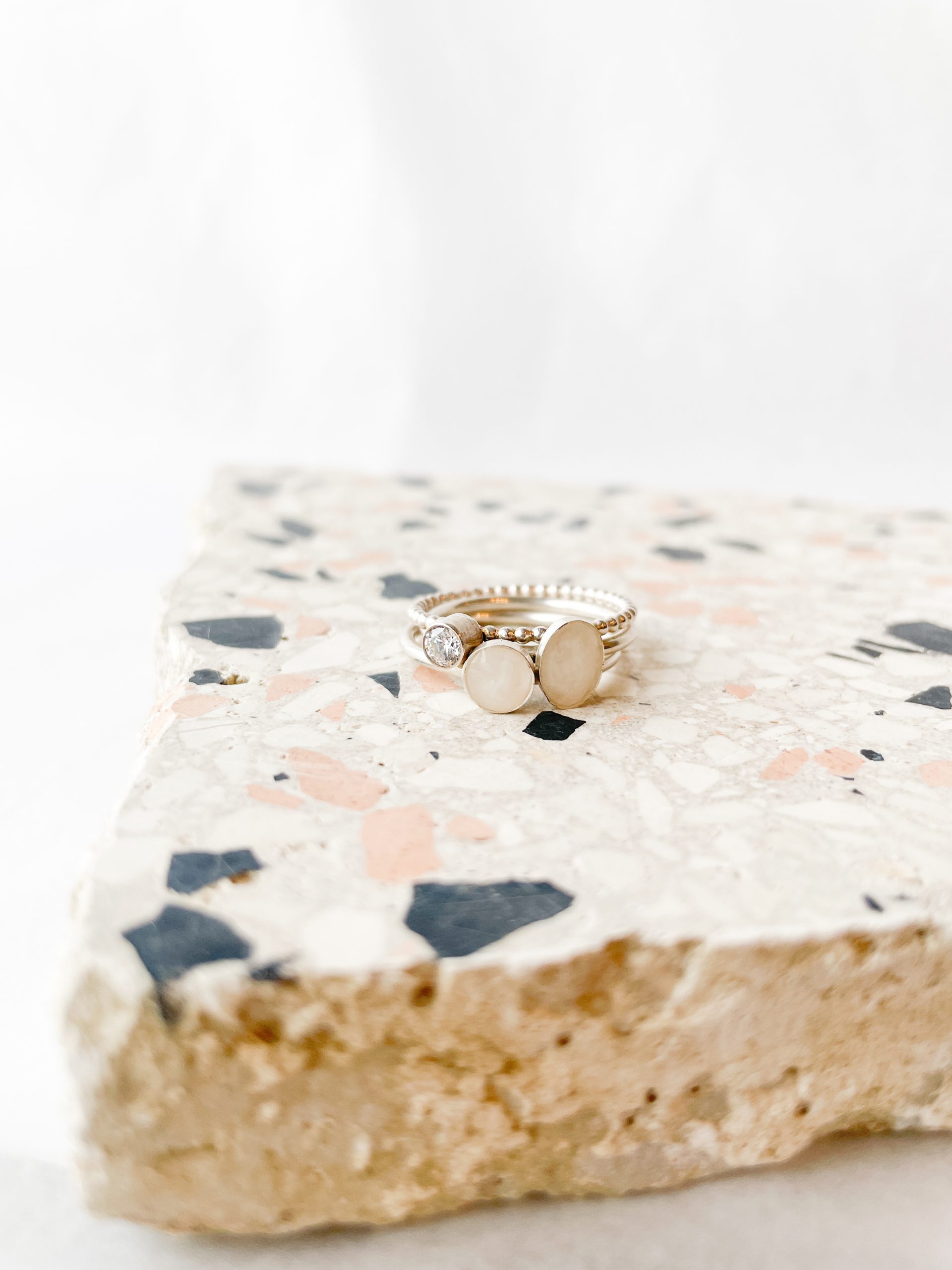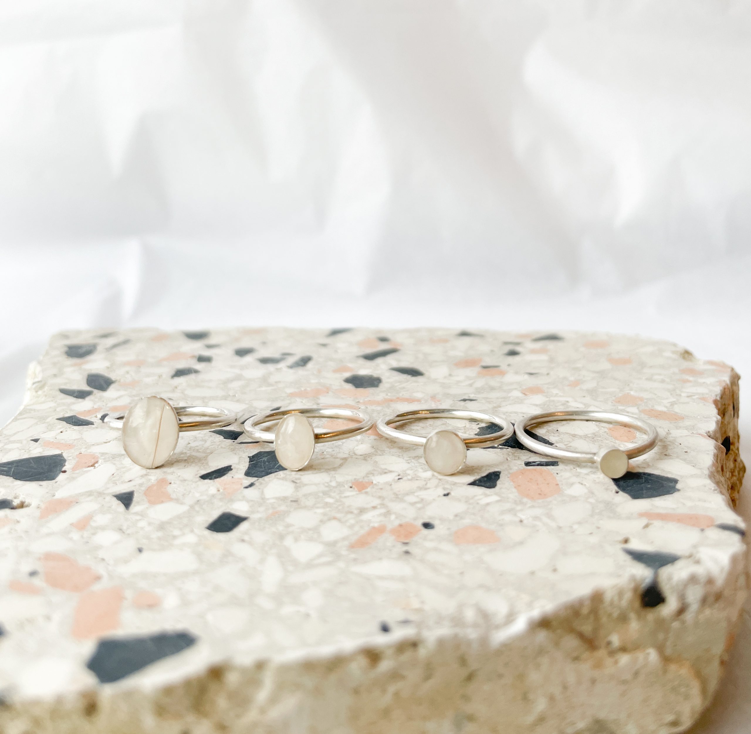 Deze fijne stapelring draagt een subtiele inclusie naar keuze, zoals moedermelk, en staat symbool voor een moment dat je gevormd heeft.