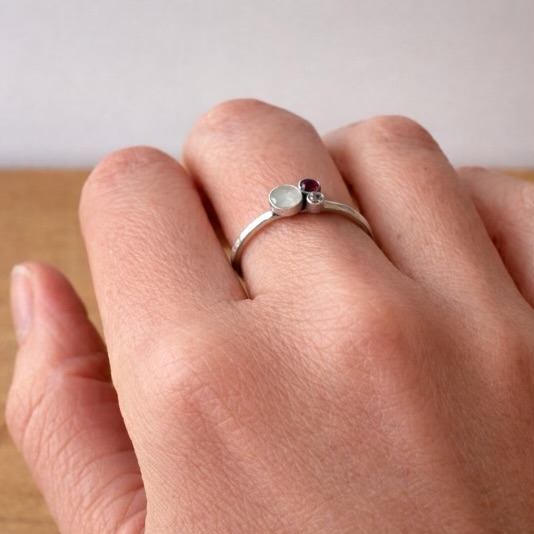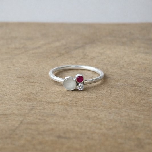 Deze fijne stapelring is gemaakt van ruw gehamerde draad en heeft een inclusie naar keuze in een steen van 5mm, zoals moedermelk, in combinatie met 2 geboortesteentjes.