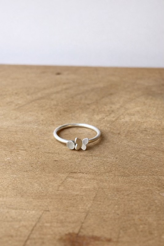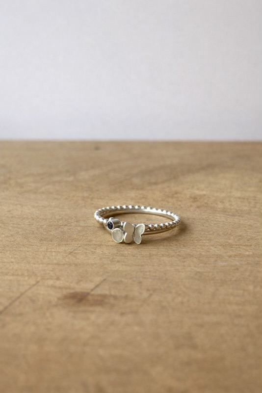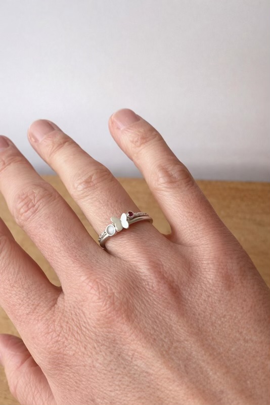 Deze fijne stapelring draagt een subtiele inclusie naar keuze, zoals moedermelk, en een mooie, kleine vlinder.